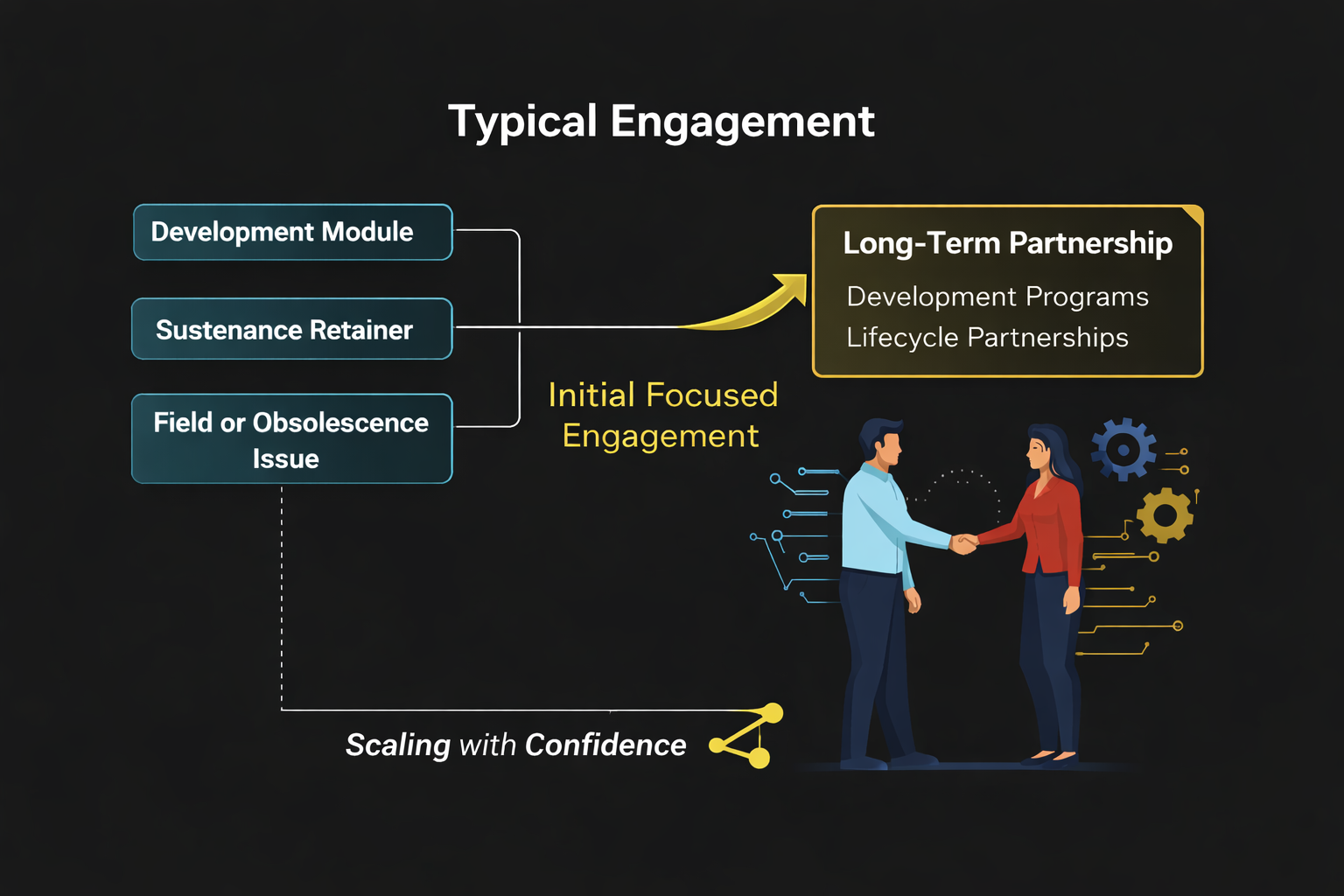 As confidence builds, relationships scale naturally into long-term development programs, sustenance retainers, or lifecycle partnerships.